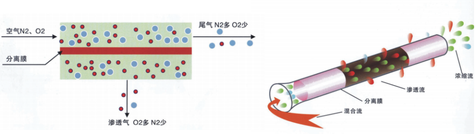 膜分離制氮機(jī)技術(shù)是根據(jù)空氣中的氮?dú)夂脱鯕庠谀蓚?cè)壓差作用下,在膜中的溶解度和擴(kuò)散系數(shù)不同而實(shí)現(xiàn)分離的,滲透率快的水蒸汽、氧氣等一些氣體先透過膜,成為富氧氣體,而滲透率較慢的氮?dú)鈩t滯留富集,成為干燥的富氮?dú)怏w,達(dá)到氧氮分離的目的。